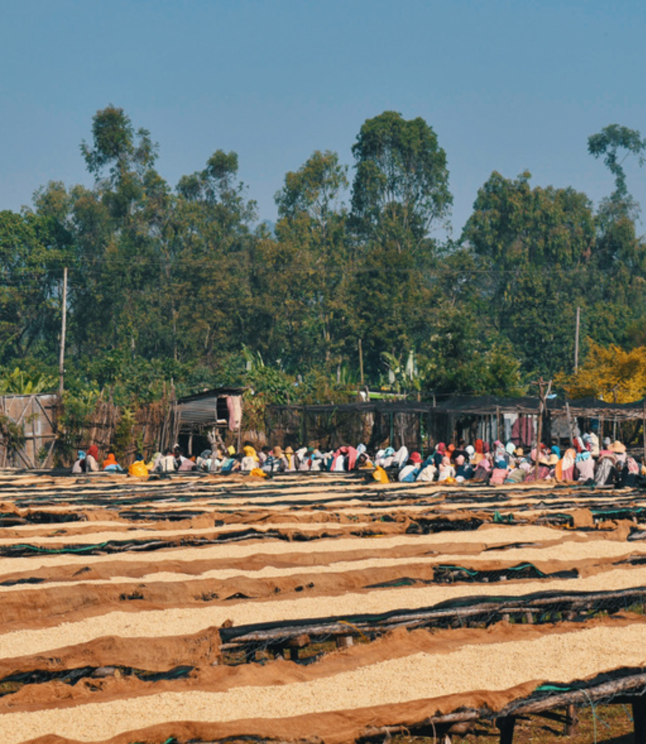 Producers in the Bombe region live in the lush and elevated valley of the Bombe mountain, surrounded by stunning landscapes. Bombe coffees are known for their density and rich flavour profiles. They often contain a higher proportion of smaller screen sizes, primarily 14 and 15, setting them apart from those from Shantawene and Keramo. Bombe coffees also feature a slightly higher percentage of the Mikicho variety, recognizable by its larger cherries, distinctive wavy leaves, and elongated, canoe-shaped seeds. Mikicho, closely related to the famous Gesha variety, contributes to the Bombe coffees' renowned tropical fruit notes and delicate floral undertones, which are apparent in every cup.