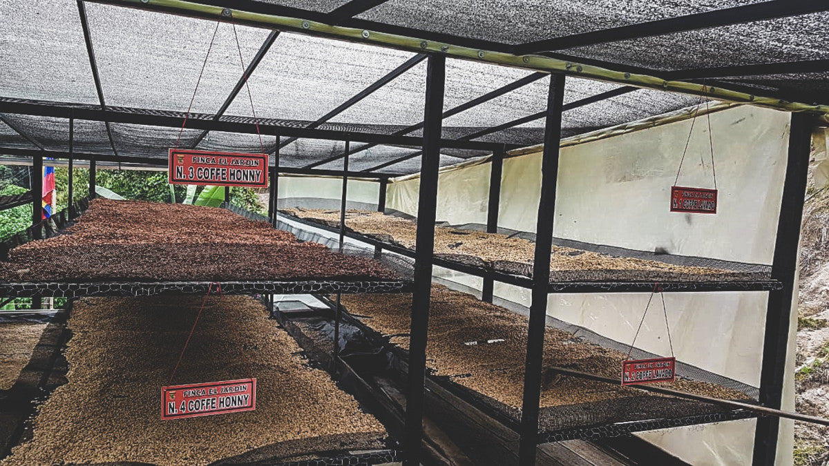 Next, the coffee undergoes a precise drying process. Initially, it is mechanically dried at a constant temperature of 30 degrees Celsius for 28 hours. Afterwards, Jorge places the coffee in fique bags and keeps it in a dark place with an average ambient temperature of 20 to 24 degrees for 24 hours. He then dries it again for 48 hours in a greenhouse, where the temperature ranges from 30 to 34 degrees. After a 24-hour resting in fique sacks, the coffee is mechanically dried for a final time at 38 degrees for 48 hours. Finally, the coffee is cooled, stabilized, and packed in bags.